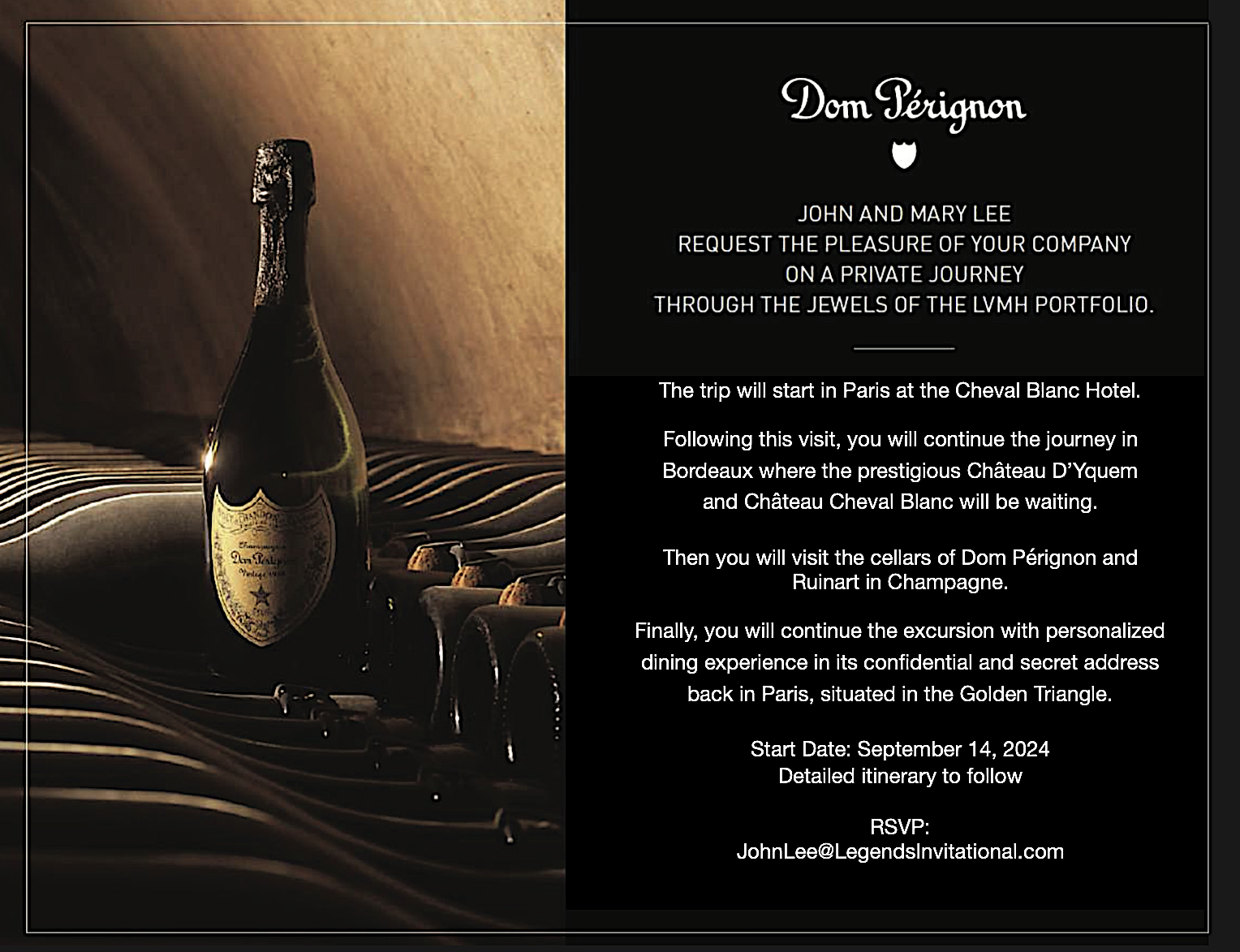 We are extremely honored and excited for Dom Pérignon to co-host with our dear friends Mary & John Lee and Fine Wine Society, our next adventure to France for a Private Journey Through the Jewels of the LVMH Portfolio. This will be an extraordinary opportunity to create wonderful memories together.